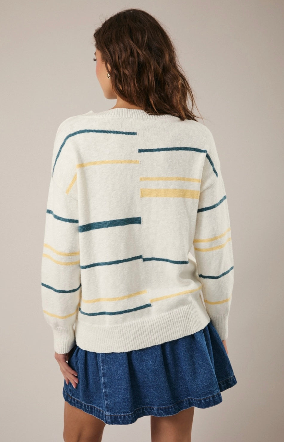 This V Neck sweater is the perfect transition piece. Still warm enough for the chill, but light colors for that spring feel.